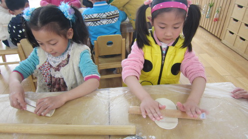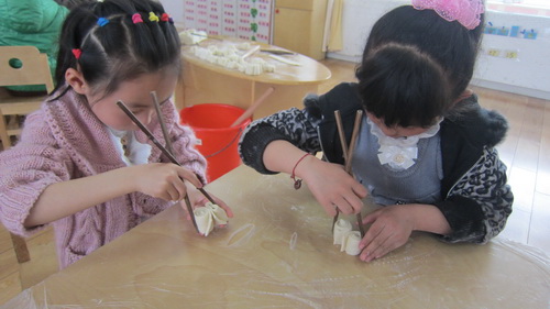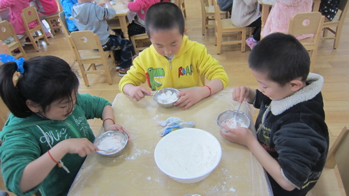 为了让孩子们了解更多的淮扬风味小吃,感受浓厚的面食文化。幼儿园提供了充足的食材让孩子们大展身手。大班的孩子制作的美食有“蝴蝶花卷”、“彩色面条”、“烧麦”。瞧!他们有的和面,有的擀面,有的拧烧麦皮,忙得不亦乐乎,就连关工委的老奶奶也来帮忙了。大家齐聚一堂,分工协作,一盘盘可口的美食在他们的精心创作下出炉了。