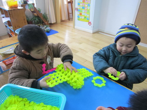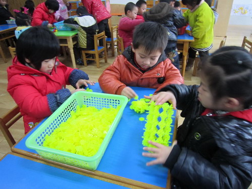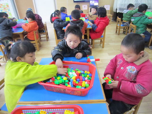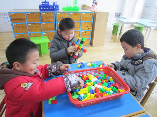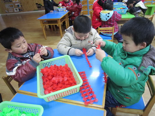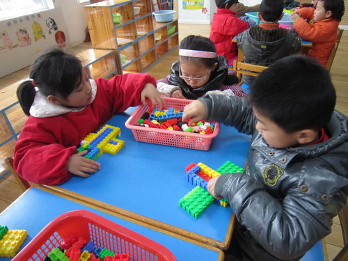 通过上次的直升机的建构,孩子们对飞机的组成和特征有了一定的了解。在本次活动中前面三组小朋友三个人一组合作用雪花片建构轰炸机,后面四组则利用智高乐积木每人建构一架轰炸机。通过本次活动,孩子的建构能力和合作能力有了很大的提高。