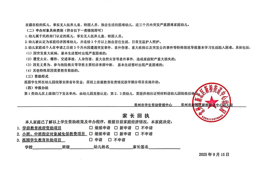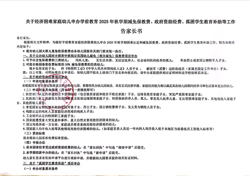 关于 经济困难幼儿申办学前教育2025年秋学期减免告家长书