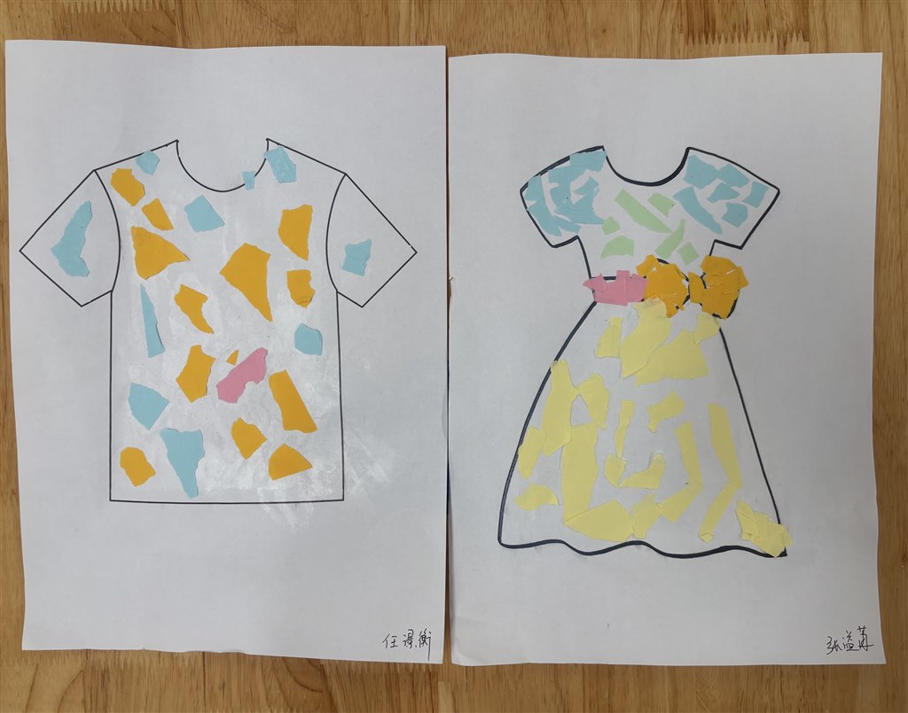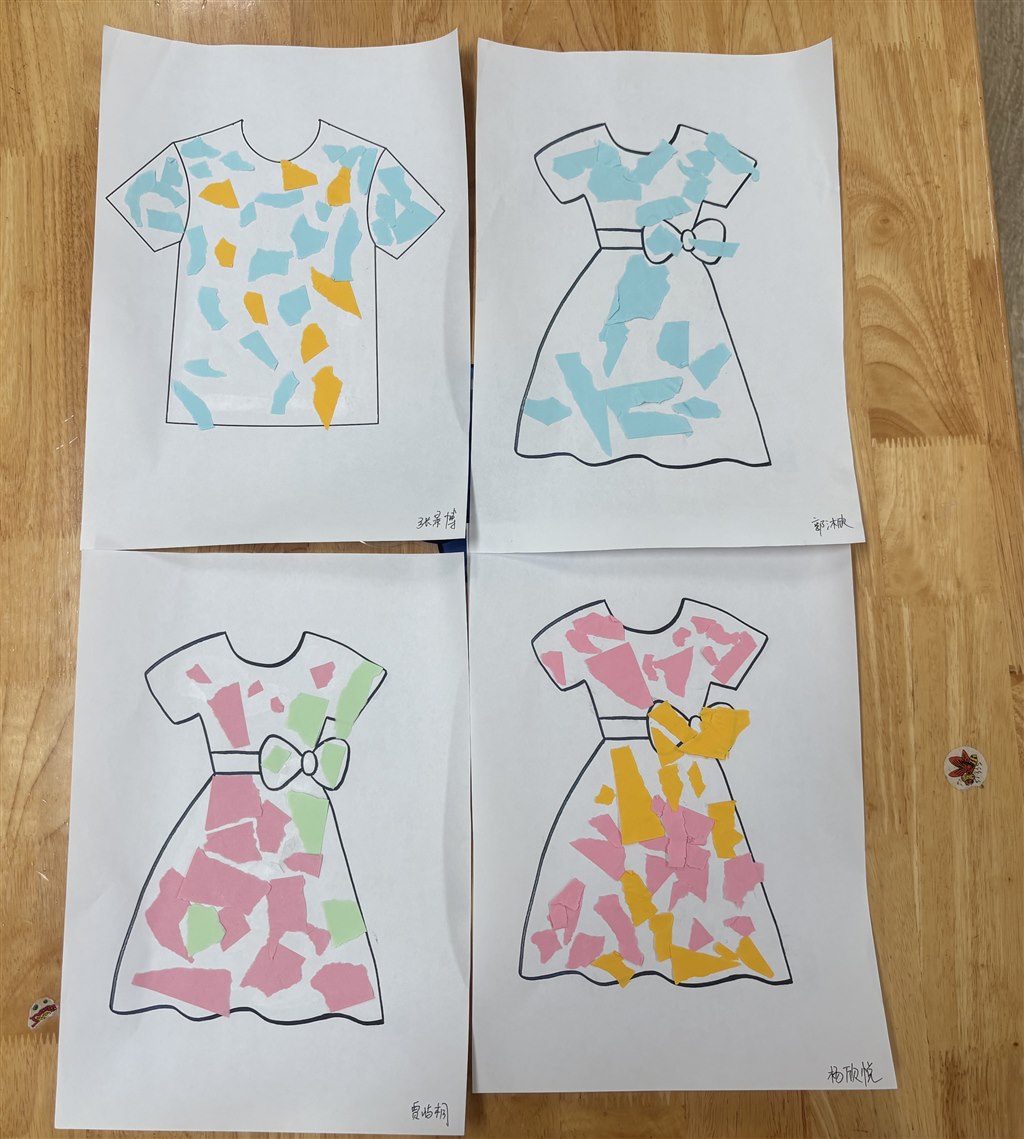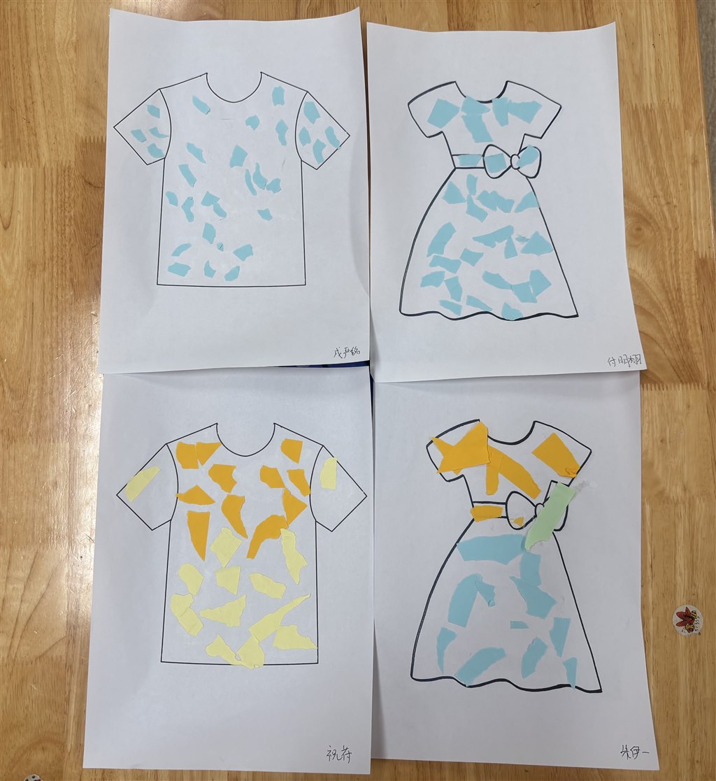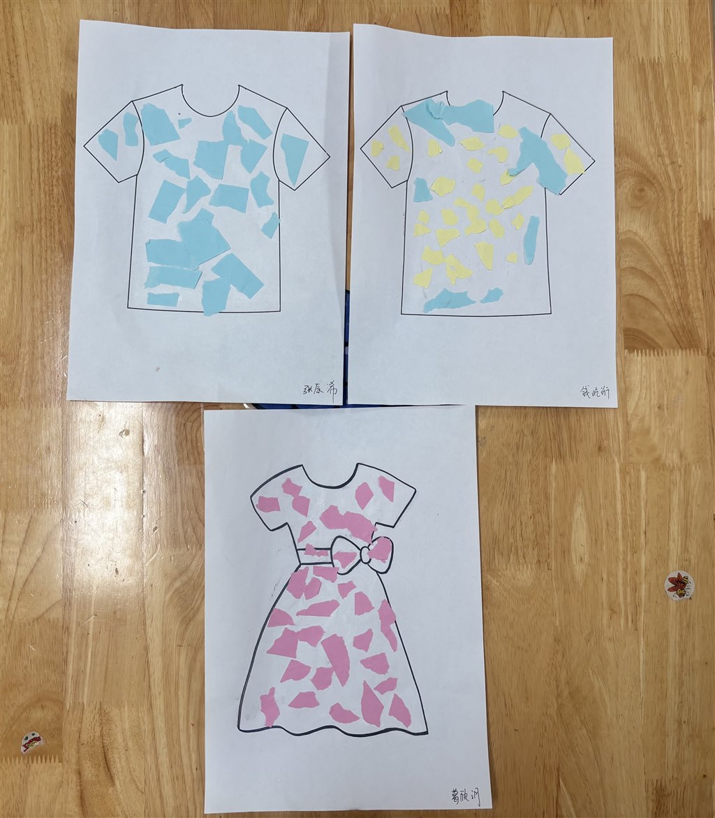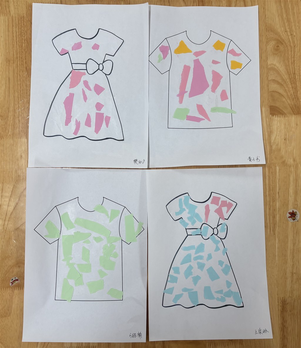 宝贝们用彩纸撕一撕、粘一粘的方式装饰漂亮的衣服!快来看看我们的作品吧!